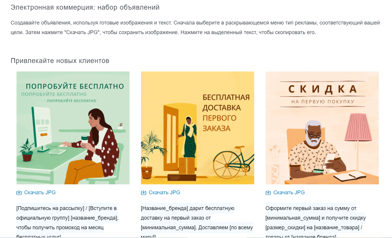 Якщо запропонований набір шаблонів вам не підходить, то вам будуть запропоновані поради щодо створення креативів і перелік сервісів, за допомогою яких ви зможете досить швидко створити рекламне оголошення.