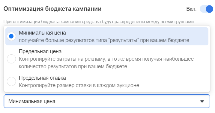 - Мінімальна ціна — алгоритм буде викуповувати місце на аукціоні за "максимально мінімальною" ціною.