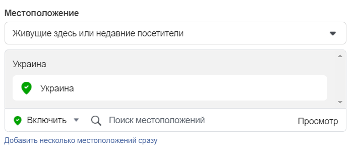 Місця. Під час налаштування реклами можна вибрати, кого вона охопить: всіх людей, тільки тих, хто постійно живе в даній місцевості, туристів або недавніх відвідувачів. Вказуючи регіон, можна вибрати країну, місто чи звузити його до радіусу навколо точки на карті (від 1 км). Ви можете додавати і виключати регіони у подальшому.