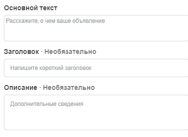 Нижче ви побачите блок для заповнення: основний текст оголошення, заголовок і заклик до дії. Текст рекламного оголошення — важливий аспект успішної рекламної кампанії, тому намагайтеся опрацювати його на 100%. Пропишіть коротко вашу пропозицію, перерахуйте вигоди і переваги для клієнта, додайте заклик до дії.