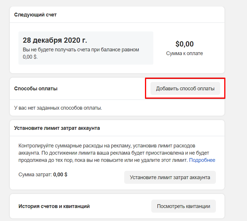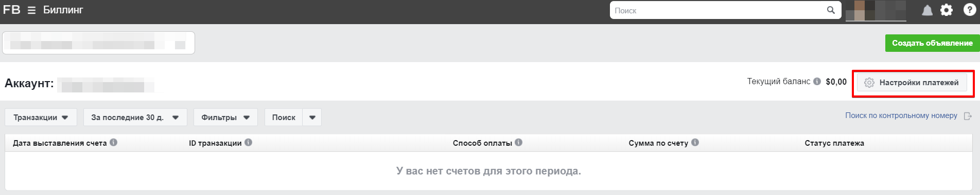 - Прив'язка банківської карти, з якої буде проводитися оплата. Для цього потрібно зайти в розділ "Білінг" у рекламному кабінеті Facebook. Тут ми будемо бачити всі транзакції, які відбувалися в нашому рекламному кабінеті.