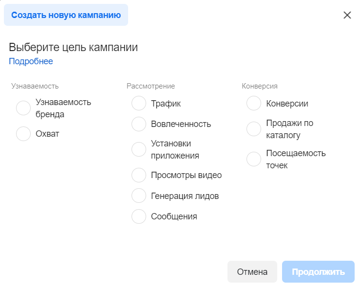 - Вибір мети рекламної кампанії. Від вибору мети залежать всі подальші налаштування, тому перш за все визначте для себе, які завдання ви хочете закрити за допомогою таргетованої реклами.