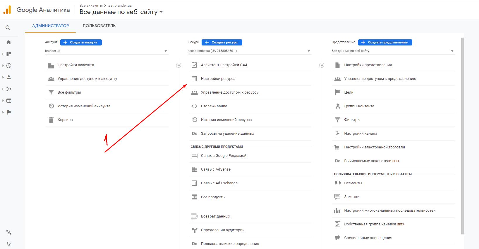 - Спочатку потрібно скопіювати ідентифікатор ресурсу GA, що створений раніше. Для цього заходимо на вкладку Налаштування ресурсу.