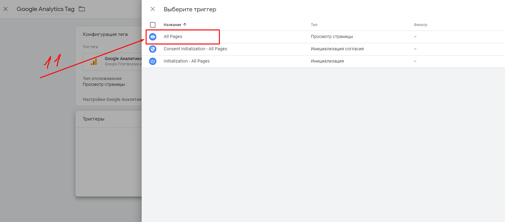 - Тепер нам потрібно вибрати тригер All Pages. Він активуватиме цей тег під час перегляду будь-якої сторінки нашого сайту.