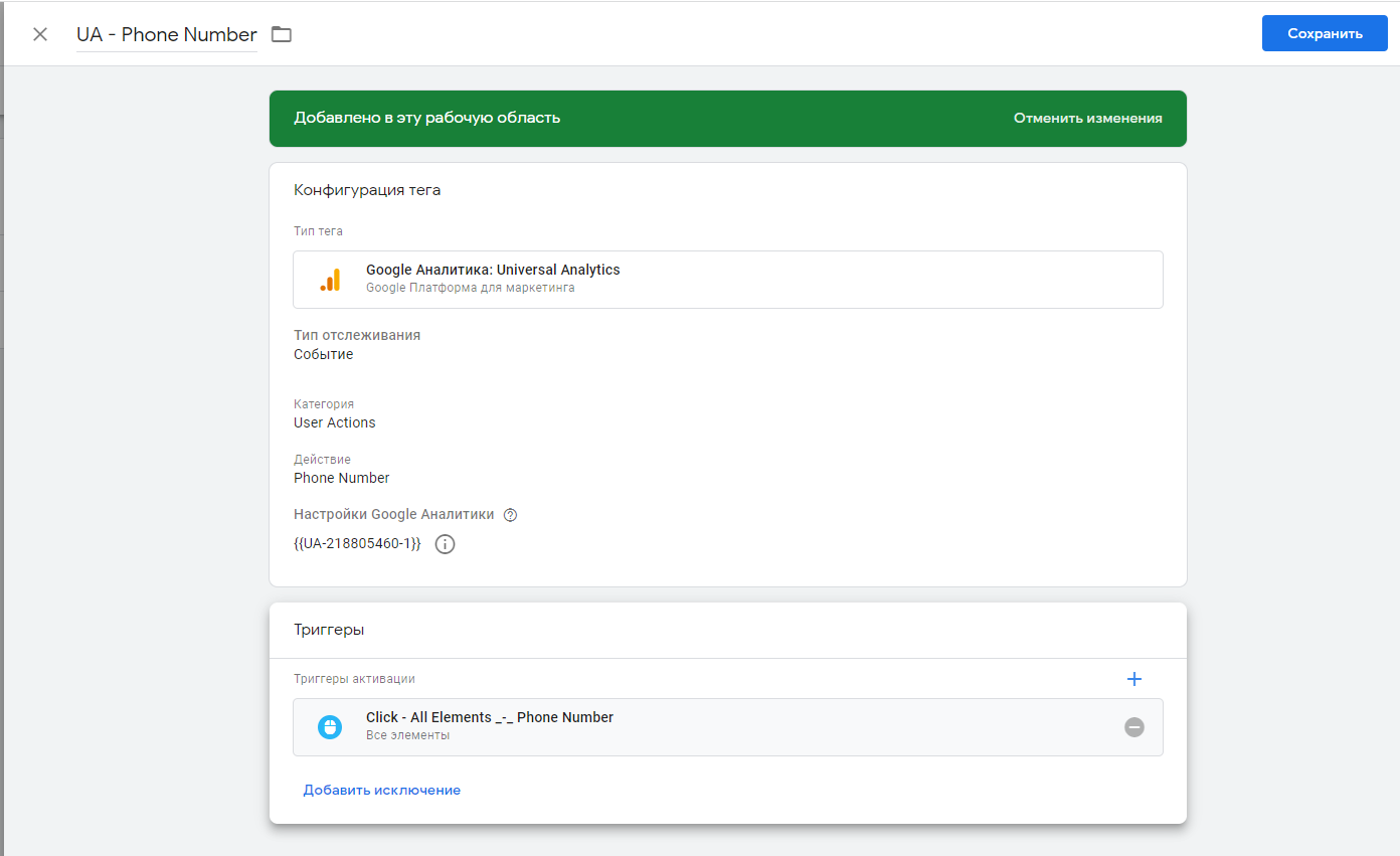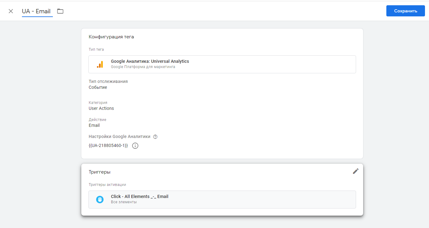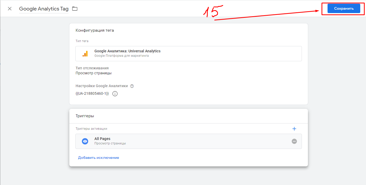 Про те, як налаштовувати теги, ви вже знаєте і встигли розібратися в цьому на попередніх прикладах, тому пропустимо цей етап у розгляді прикладу. Перед збереженням, тег має виглядати таким чином.