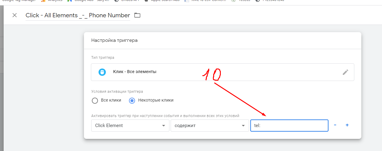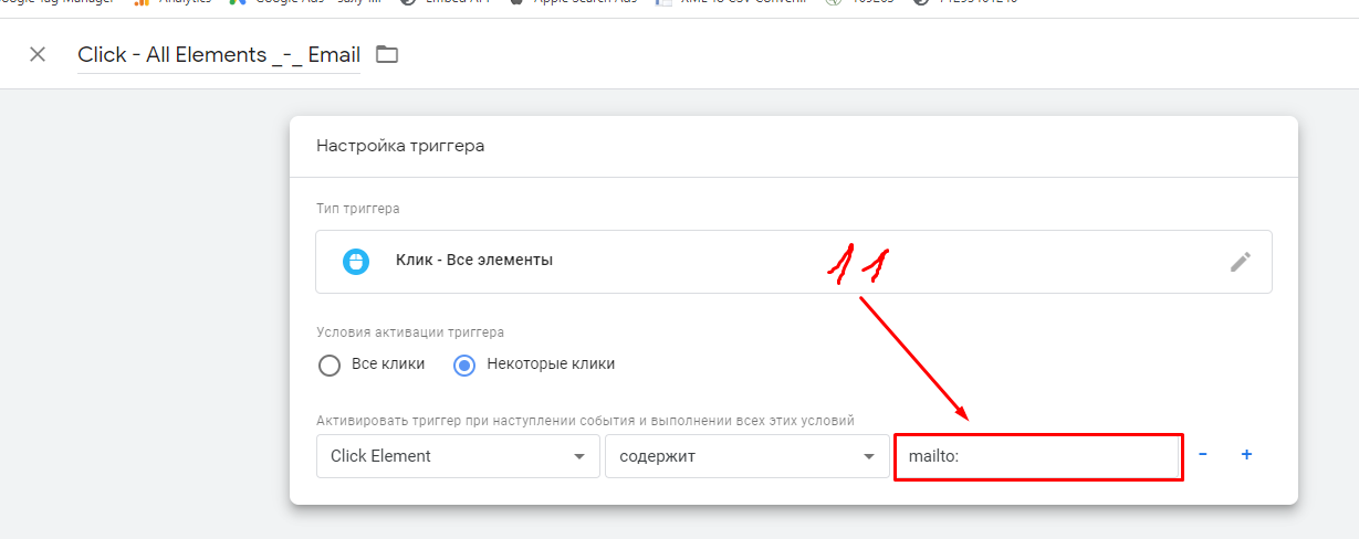 - У такий же спосіб створюємо тригер для електронної пошти, змінюючи значення, яке має містити змінна Click Element на "mailto:".