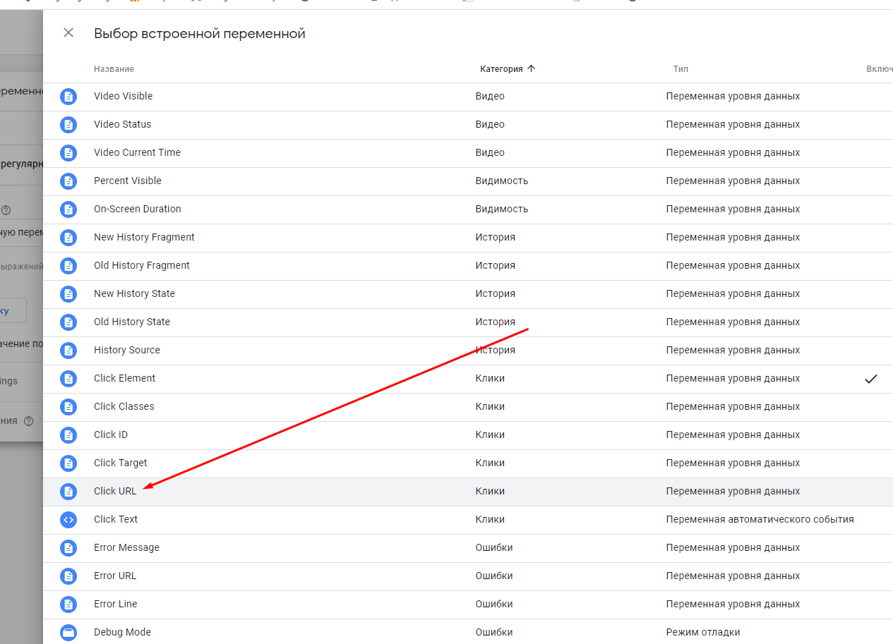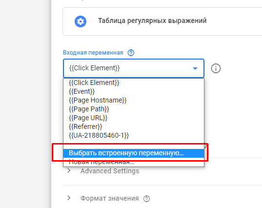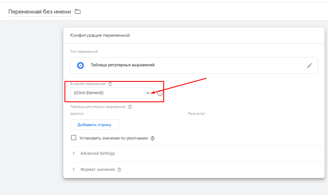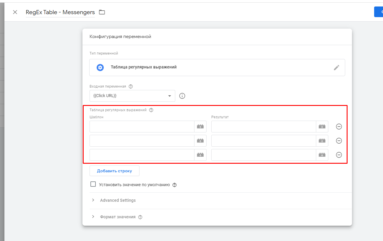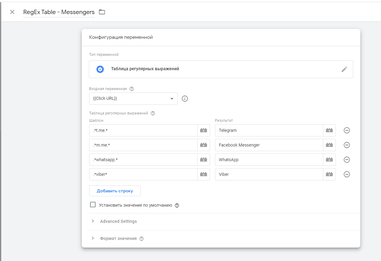 Вхідна змінна — це змінна, з якої зчитуються значення. Змінна Click URL містить посилання, за яким зробили клац. Вписавши певний шаблон посилання як регулярний вислів, посилання можна зіставити з відповідним значенням у колонці Результат. Отже, якщо посилання має вигляд https://t.me/branderstudio, то у разі натискання на нього як результат буде підставлено значення Telegram.