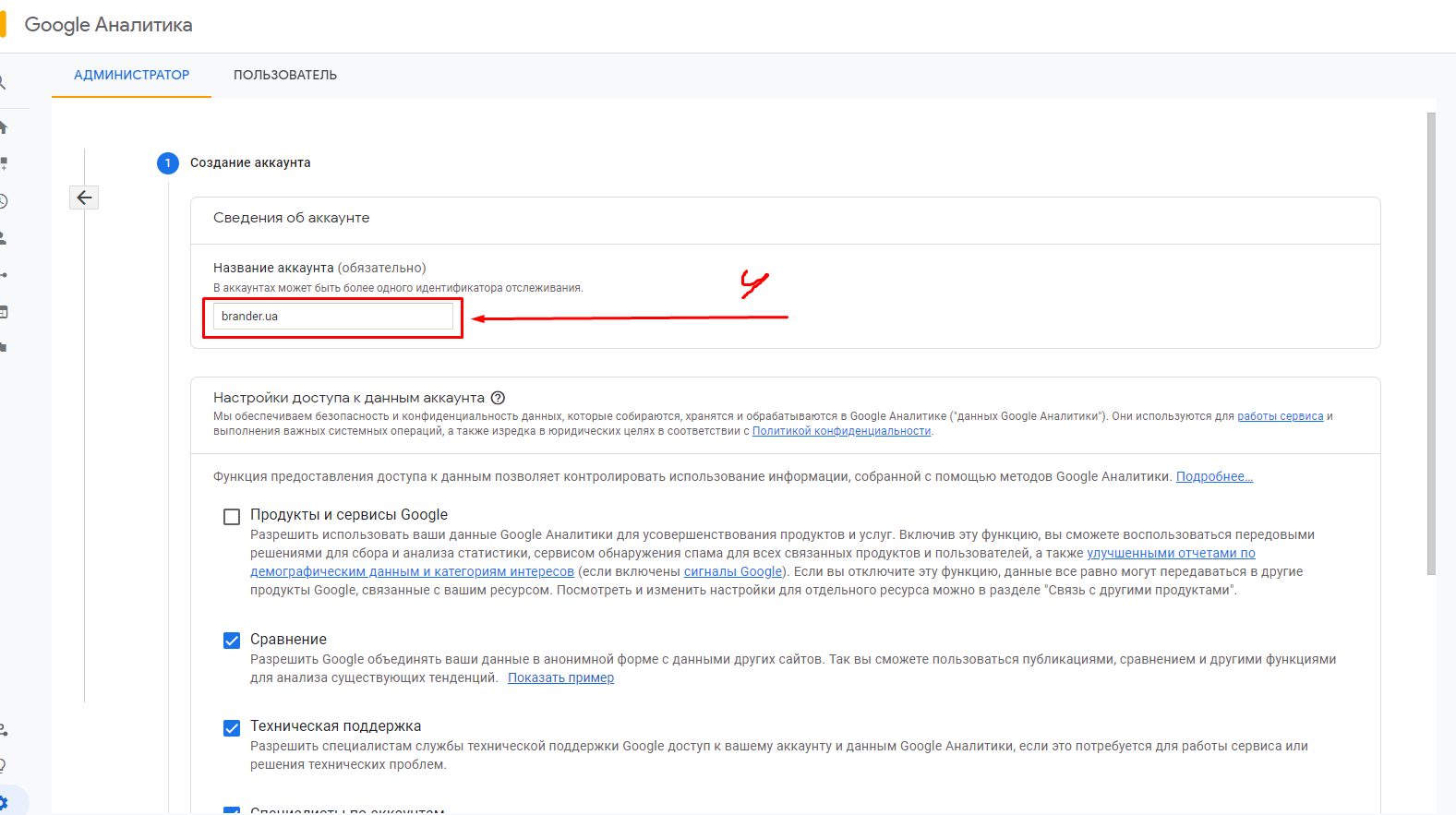 - Необхідно вказати назву нового акаунту. Рекомендуємо використовувати зрозумілу назву, яка спрощує навігацію. Найчастіше як назву акаунту вибирають основний домен сайту.