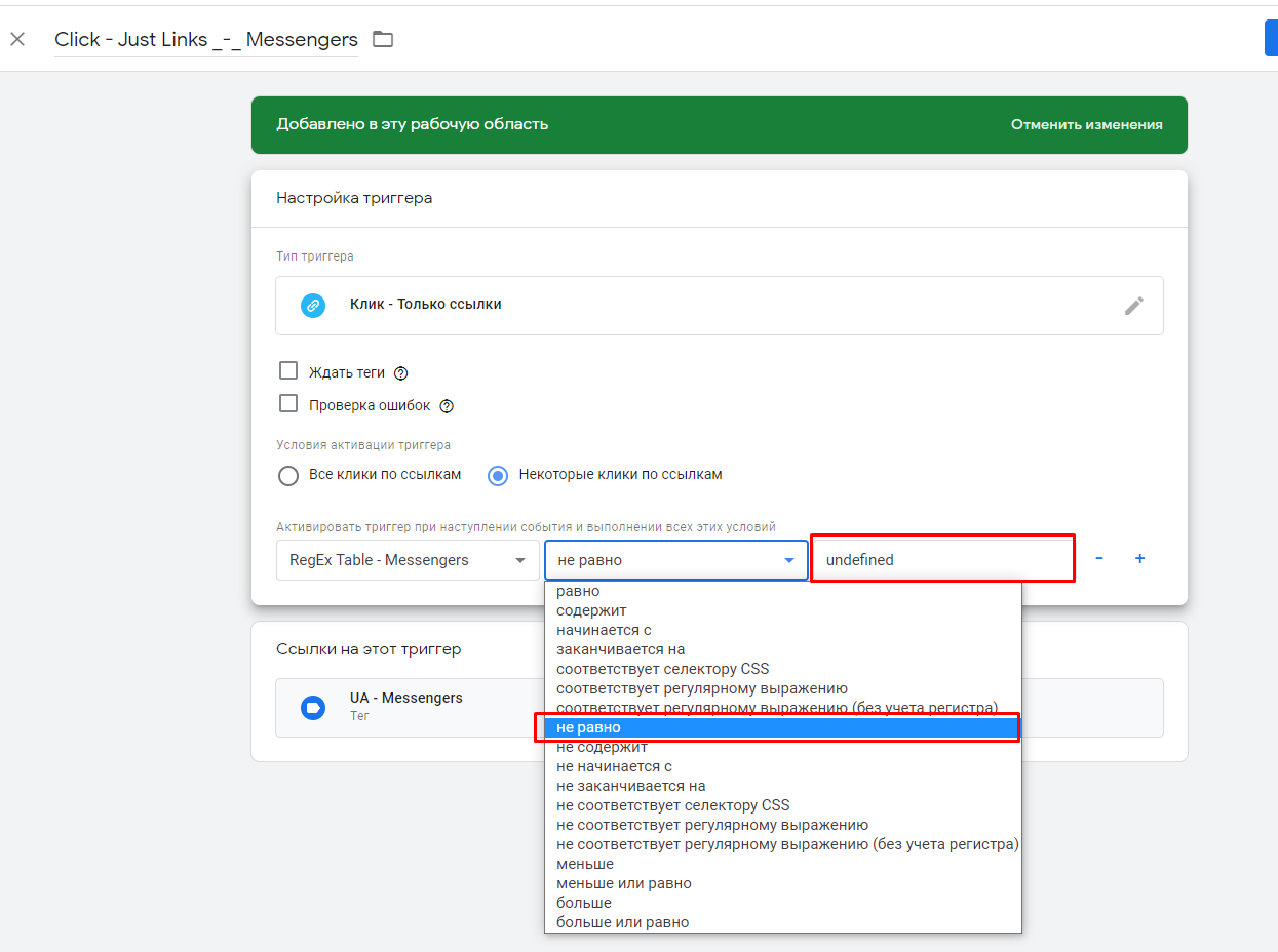 - Вибираємо змінну, яку створили для ярлика події та вибираємо умову не дорівнює, а значення вказуємо undefined, оскільки отримуємо це значення тільки в тому випадку, коли посилання не включено в таблицю регулярних висловів.