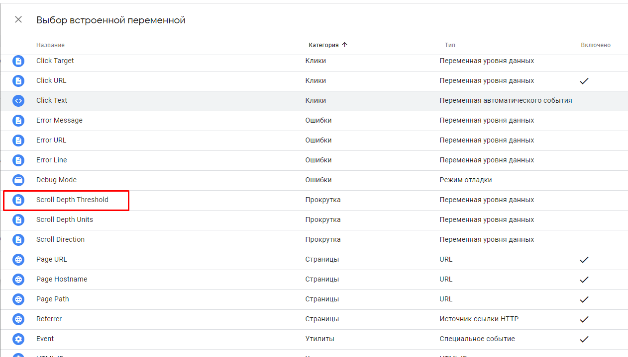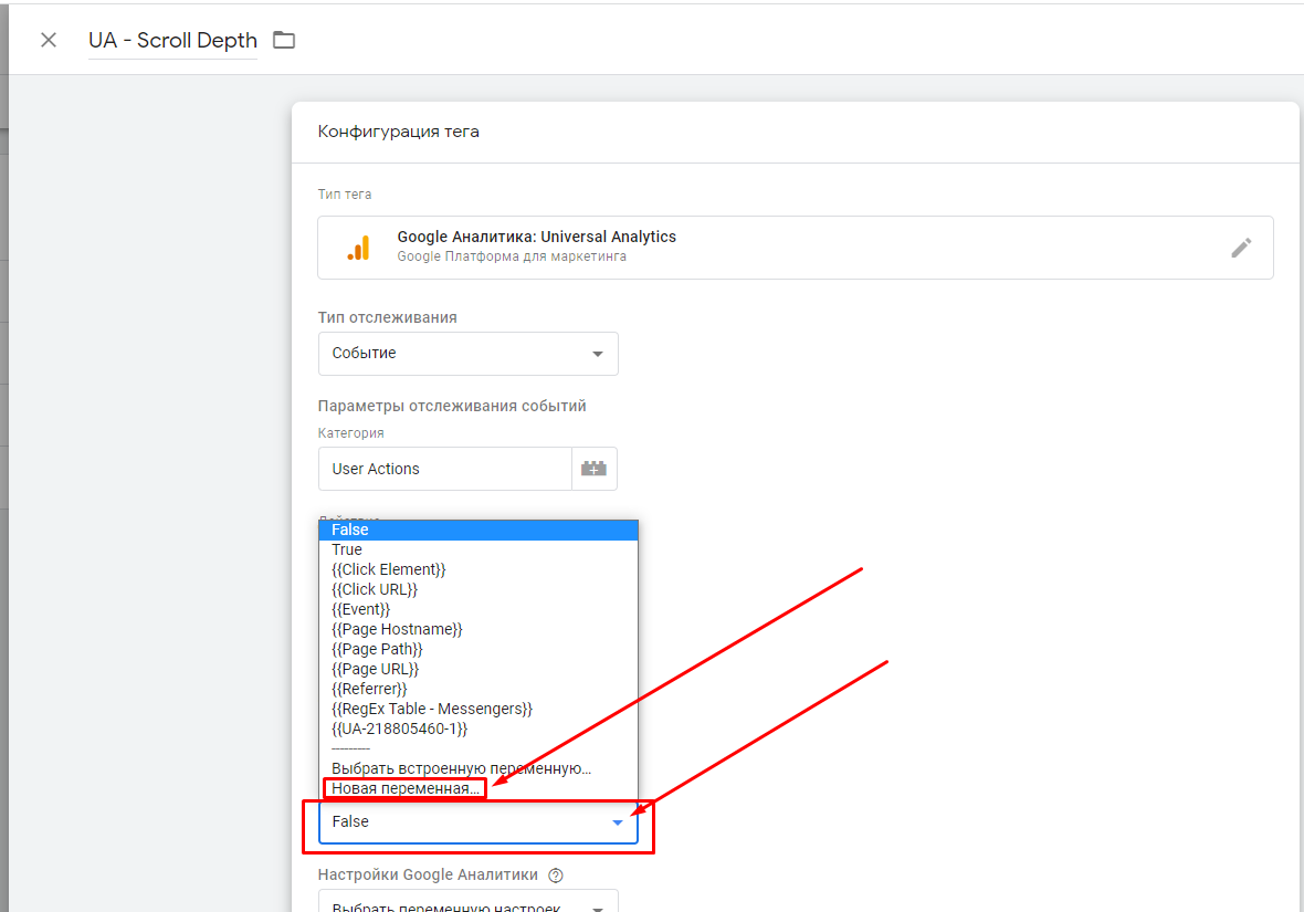 - Повторюємо кроки 1–3 попереднього етапу, але як змінну ярлик події вибираємо вбудовану змінну Scroll Depth Threshold (ця змінна містить інформацію про те, наскільки відсотків була прокручена сторінка).