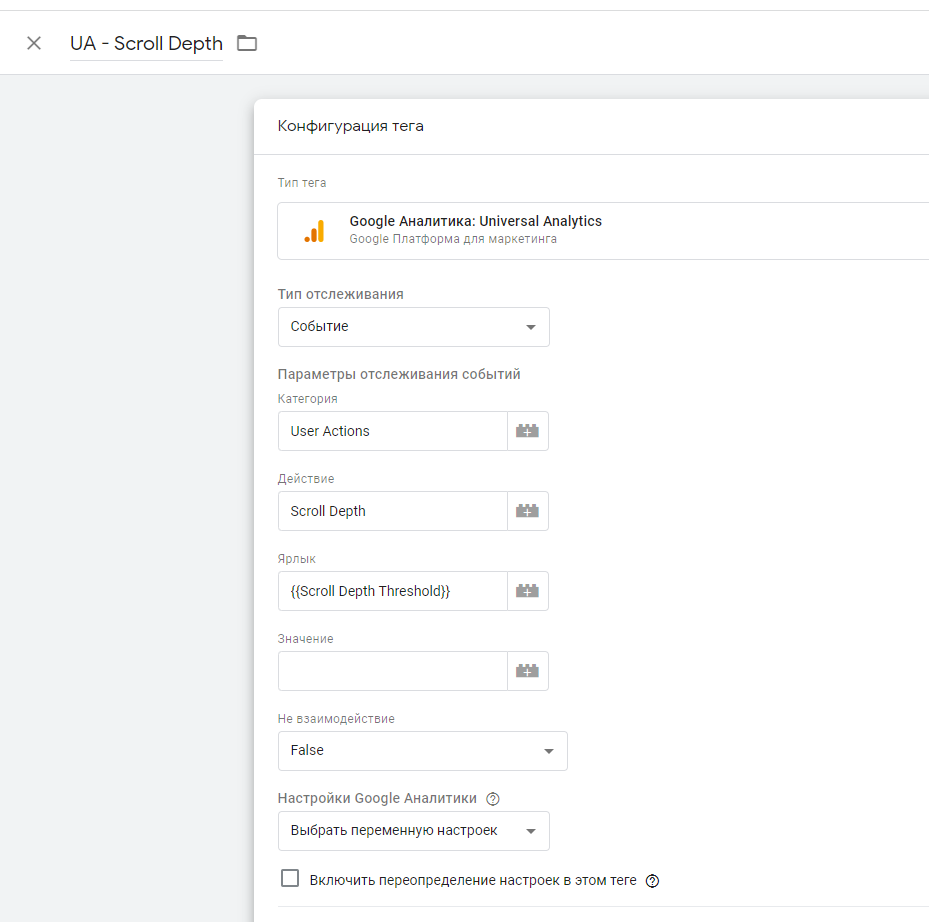 Зважаючи на цей факт, для значень змінної Scroll Depth Threshold, які дорівнюють 75 та 100 — взаємодія буде зарахована, а відповідна ціль буде досягнута. Водночас інформація про прокручування на 25 і 50 відсотків буде передана в Google Analytics, але не призводитиме до досягнення взаємодії та цілі, не занижуючи цим показника відмов.