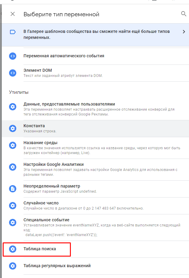 - Створюємо нову змінну типу Таблиця пошуку, щоби використовувати її як значення поля Не взаємодія (це поле відповідає за те, буде сприйнято подія як взаємодія чи ні, впливаючи цим на показник відмов).