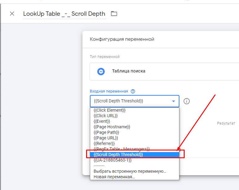 - Як вхідна змінна вказуємо змінну Scroll Depth Threshold.