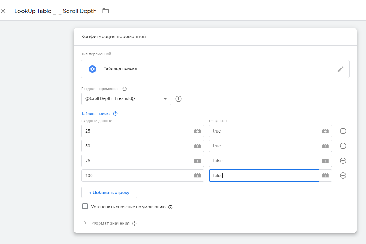 - Вхідна змінна містить дані у вигляді цілих чисел від 1 до 100. Вказуємо за якими значеннями вхідної змінної Scroll Depth Threshold значення поточної змінної буде істинним (true), а за яких — помилковим (false).