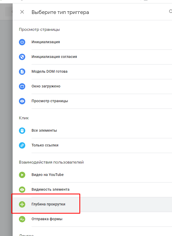 - Встановлюємо прапорець проти значення Глибина вертикального прокручування й задаємо значення прокручування у відсотках, за якому спрацьовуватиме цей тригер (25,50,75,100).