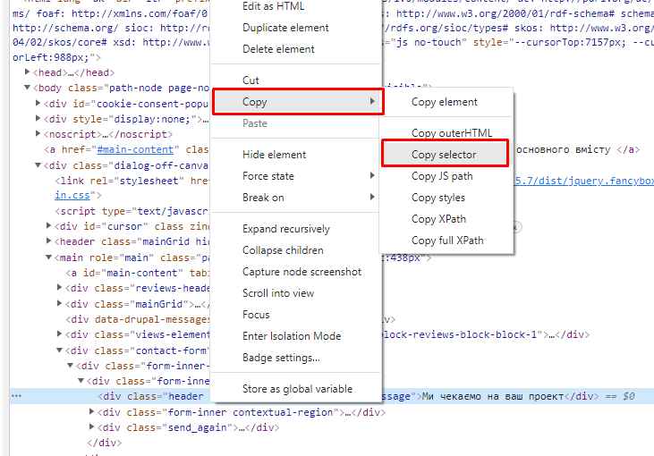 - Тепер потрібно скопіювати селектор виділеного елемента.