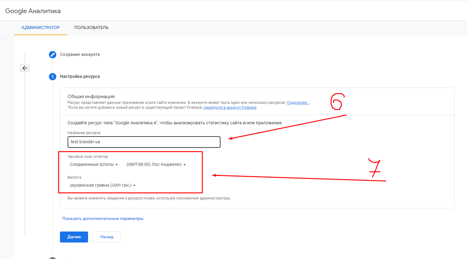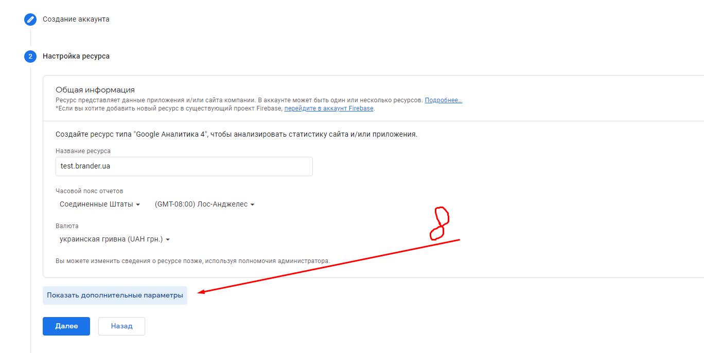 - Потрібно назвати новий ресурс. Для цього можна використовувати домен сайту, на який буде встановлено лічильник Google Analytics.