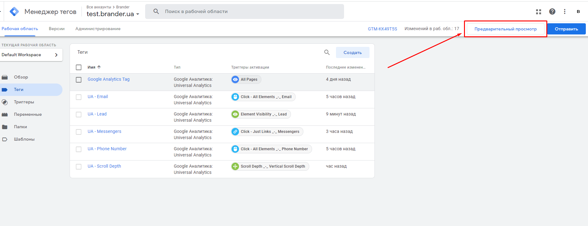 Після того, як усі теги налаштовані, треба перевірити їхню працездатність. Для цього зручно використовувати режим попереднього перегляду.