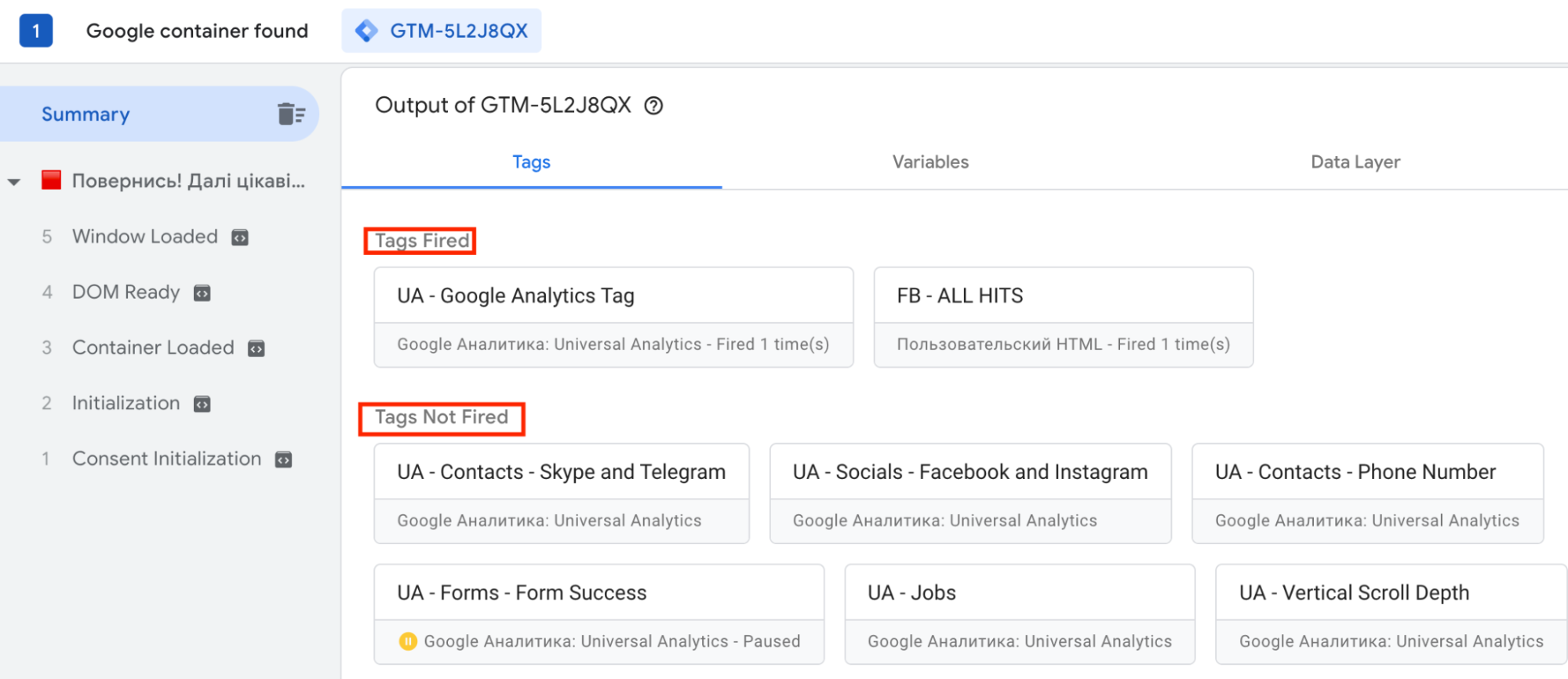 Далі треба виконати всі ті дії, які активують тригери тегів і переконатися, що вони активували відповідні теги (Tags Fired).