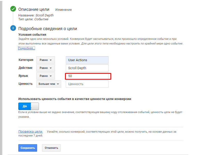 Коли налаштовуємо ціль для прокручування, нам необхідно вказати значення, за якого досягнення цілі зарахується. У прикладі беремо значення 50.
