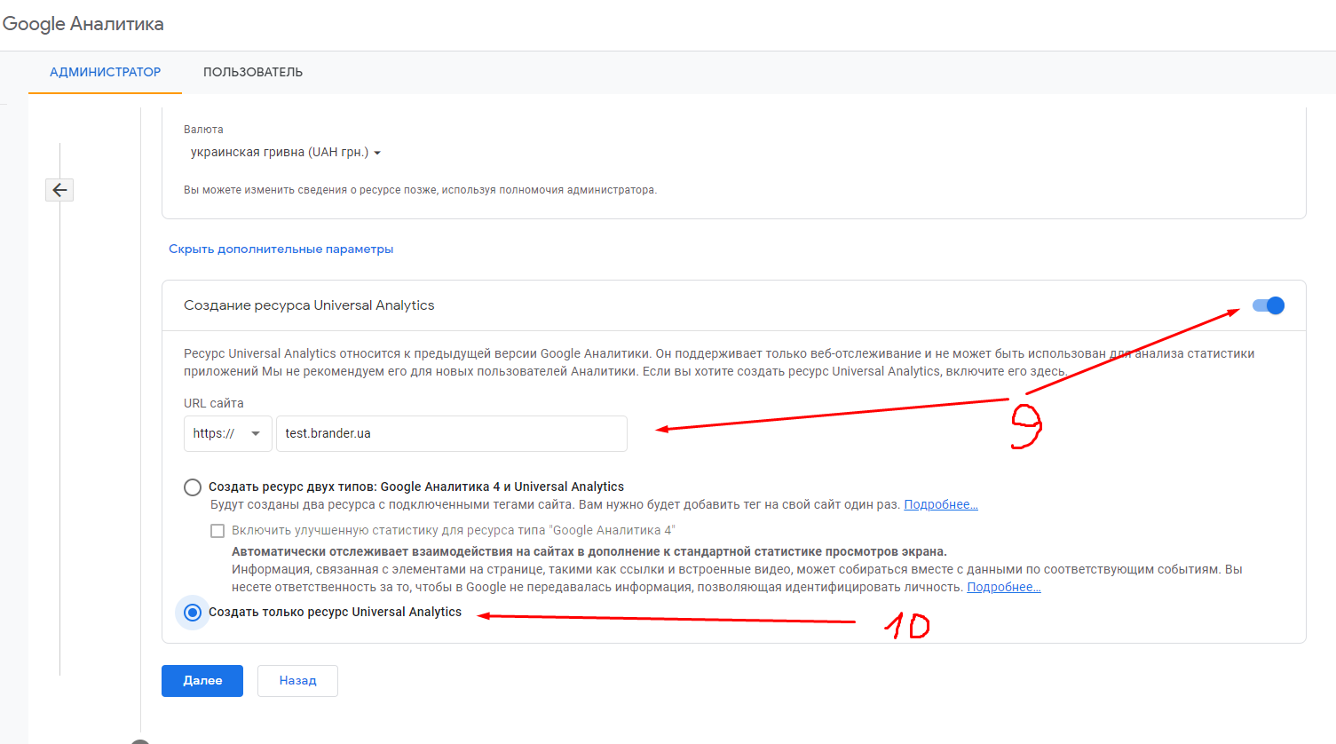 - Активуємо повзунок Створення ресурсу Universal Analytics та вказуємо URL сайту.