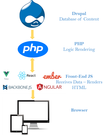 В Drupal 8/9 використовується підхід, орієнтований на API. Ключові особливості Drupal Headless CMS: свобода вибору frontend-фреймворків (React, VueJs, Angular), створюйте контент один раз — публікуйте де завгодно, API-first підхід, Drupal як єдине сховище контенту, єдине джерело істини. Ви можете публікувати контент за допомогою потужних адміністративних інструментів Drupal і в підсумку бачити його відображення на таких об'єктах, як Apple Watch, мобільні додатки або навіть рекламний щит. Це забезпечує додаткову гнучкість за рахунок включення нових передових функцій, які підтверджують статус Drupal як провідної CMS.