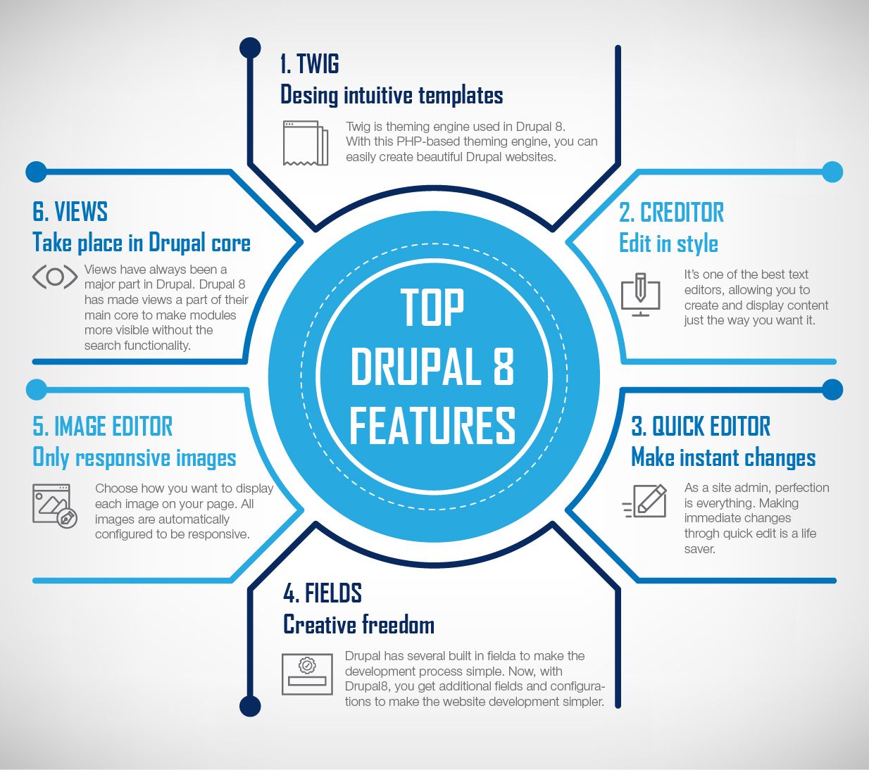 Використовуючи прості кнопки меню, ви також можете додавати зображення, форматування і гіперпосилання. З Drupal 9 ви можете редагувати і переглядати свій контент в контексті сторінки сайту. Набагато ефективніше мати можливість редагувати текст і перетягувати зображення на місце, переглядаючи його так, як його побачать кінцеві користувачі. Завдяки цьому ви можете виявити будь-які проблеми з дизайном і зручністю користування контентом і негайно вирішити їх замість того, щоб гадати про кінцевий результат. Починаючи з Drupal 8, управління контентом було спрощено, що зробило взаємодію з ним більш зручною і доброзичливою для користувача. Drupal містить безліч поліпшень, включаючи впровадження HTML5 полів, додаткові допоміжні бібліотеки, поліпшення доступності, оновлені базові теми, елементи призначеного для користувача інтерфейсу і збільшену продуктивність. Деякі з найбільш важливих функцій включають: