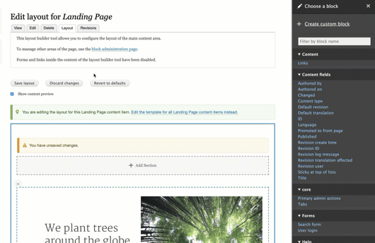 - Layout Builder: основний модуль Layout Builder (конструктор макетів сторінок) надає можливості створення різних варіантів компонування для вашого контенту прямо з адмінки без знання HTML. Layout Builder унікальний тим, що пропонує єдиний потужний інструмент візуального дизайну для шаблонного контенту, налаштовуваних сторінок і шаблонних макетів.