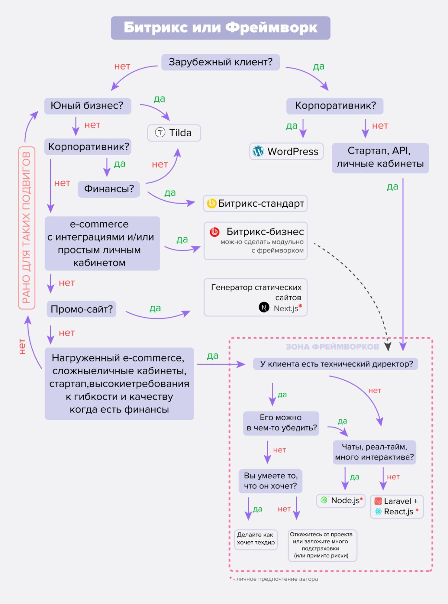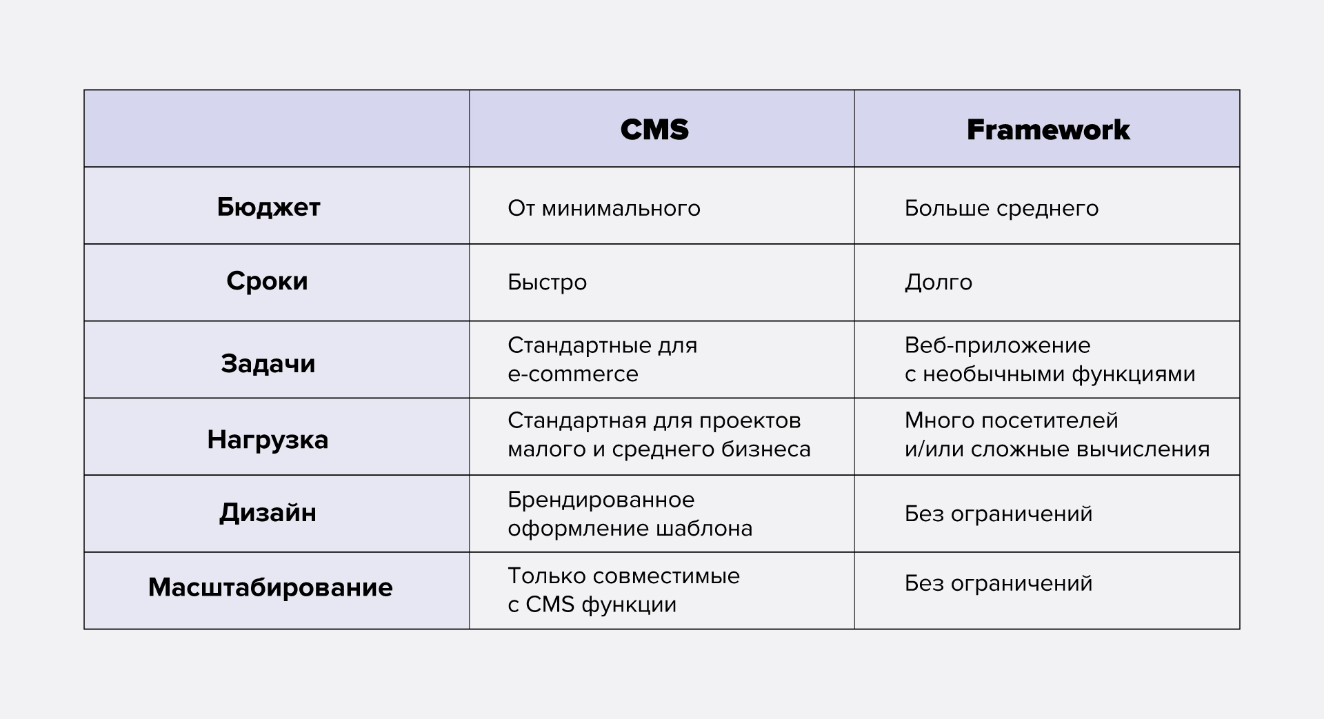 Для масштабних проєктів або невеликих, але з незвичайними пропозиціями та бізнес-процесами, краще вибрати фреймворк.