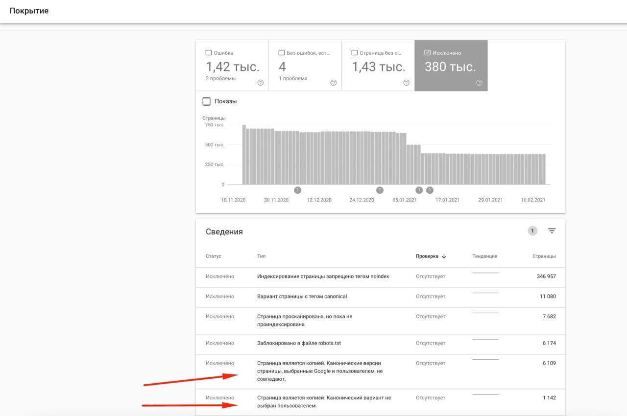 Іноді дубльований контент можливо виявити в Інструментах Google — у Search Console. Ви можете подивитися їх у розділі "Покриття" у підрозділі "Виключено".