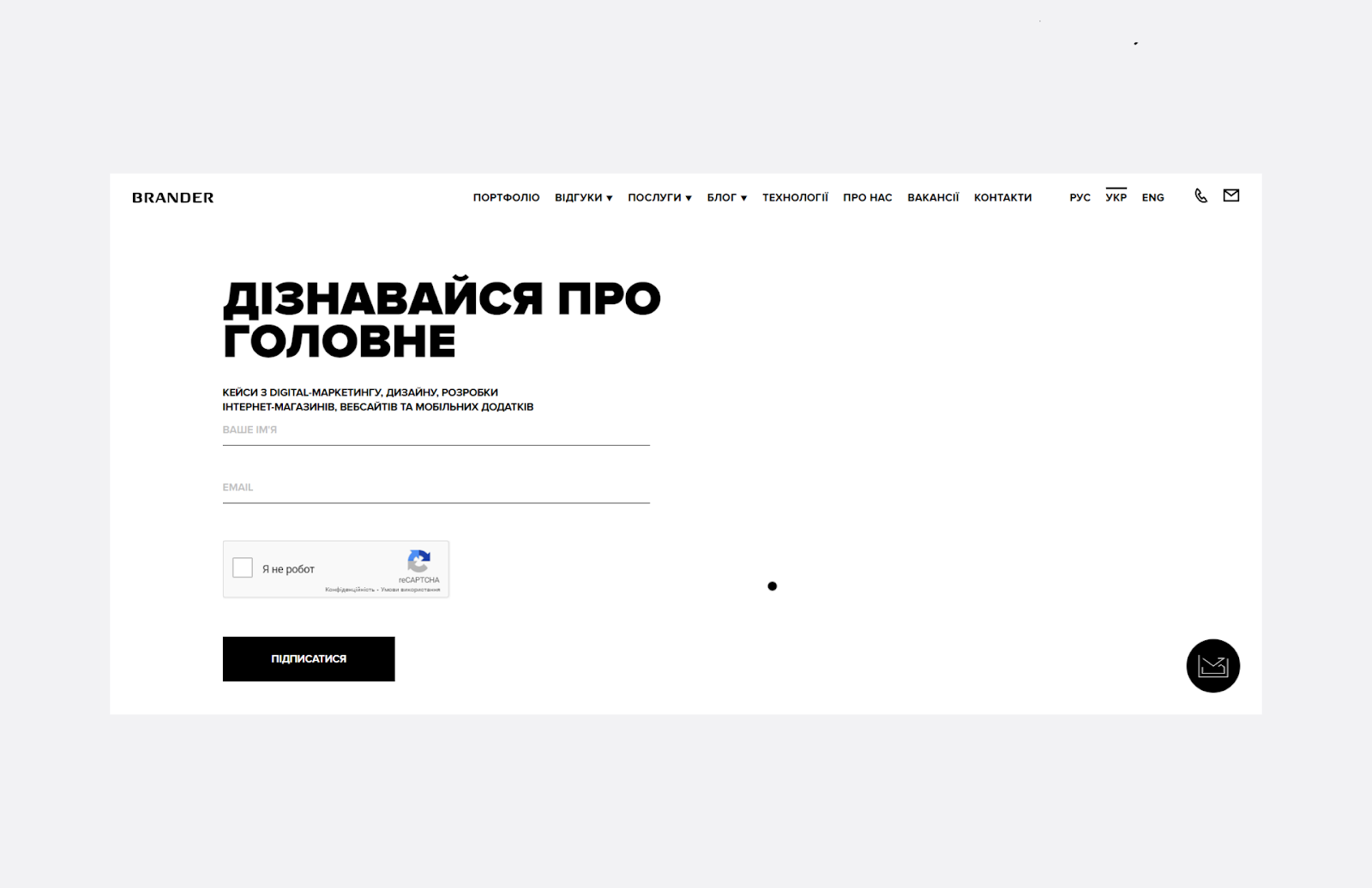 Локально, поле з підпискою може бути розташоване будь-де. Все залежить від самої архітектури сайту. Вона має бути ненав'язливою, виділятися, але не вибиватися із загальної концепції сторінки.