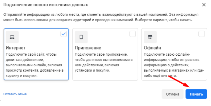 - Виберіть джерело даних. Це може бути сайт, додаток, офлайн-інформація про дії, що виконуються у магазинах або де-небудь ще поза мережею.