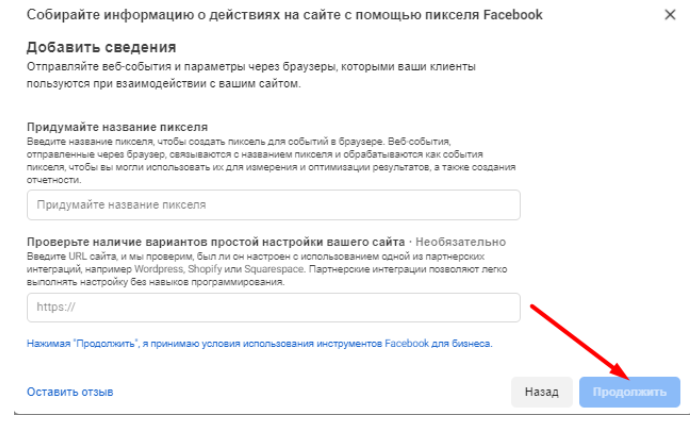 - Напишіть назву пікселя і url сайту у відповідних полях.