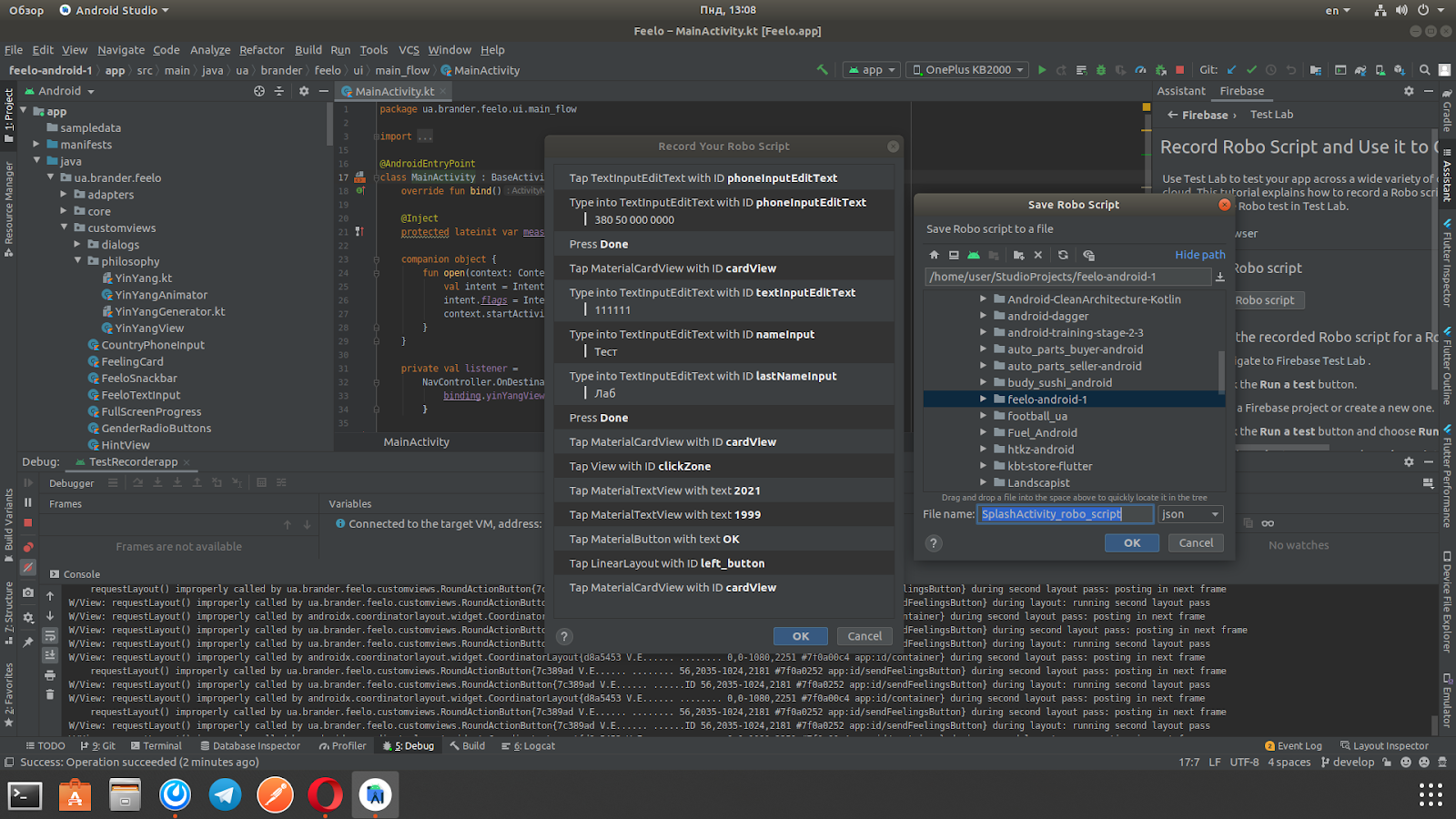 - Запускається додаток на вибраному пристрої, в студії відкривається вікно, куди виводяться записані дії. Записуємо потрібний тест-кейс і натискаємо ОК. Зберігаємо файл скрипту.
