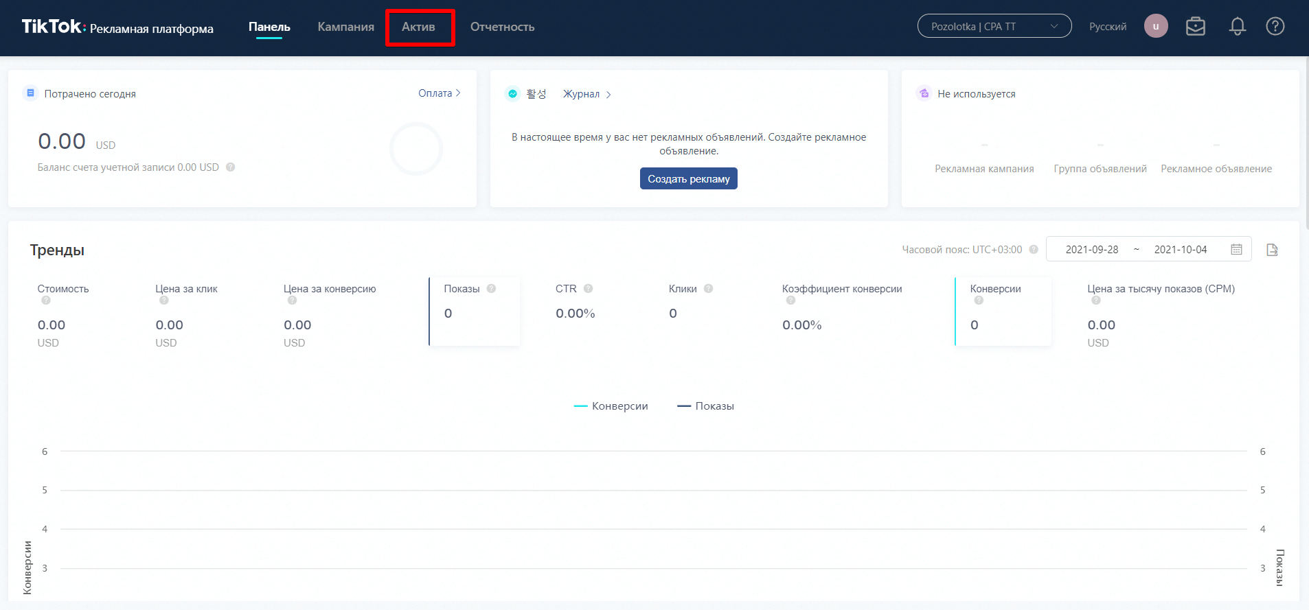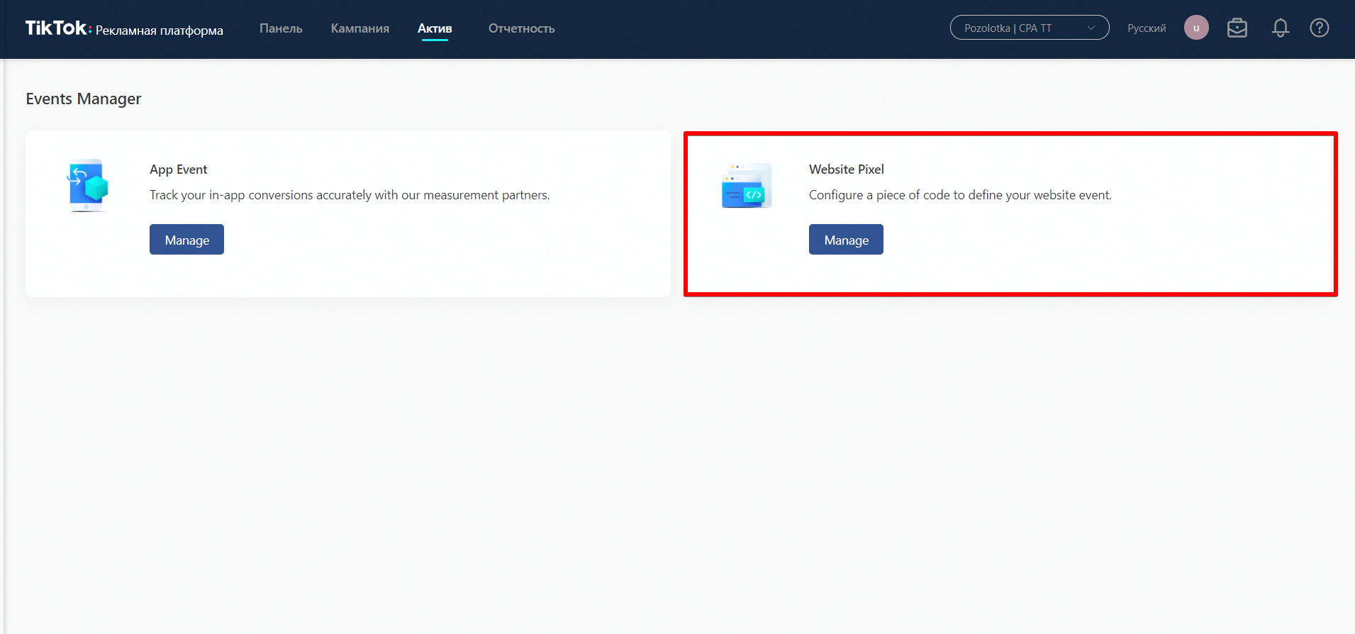 - Заходимо до кабінету Tik Tok та переходимо на вкладку Актив та Події.