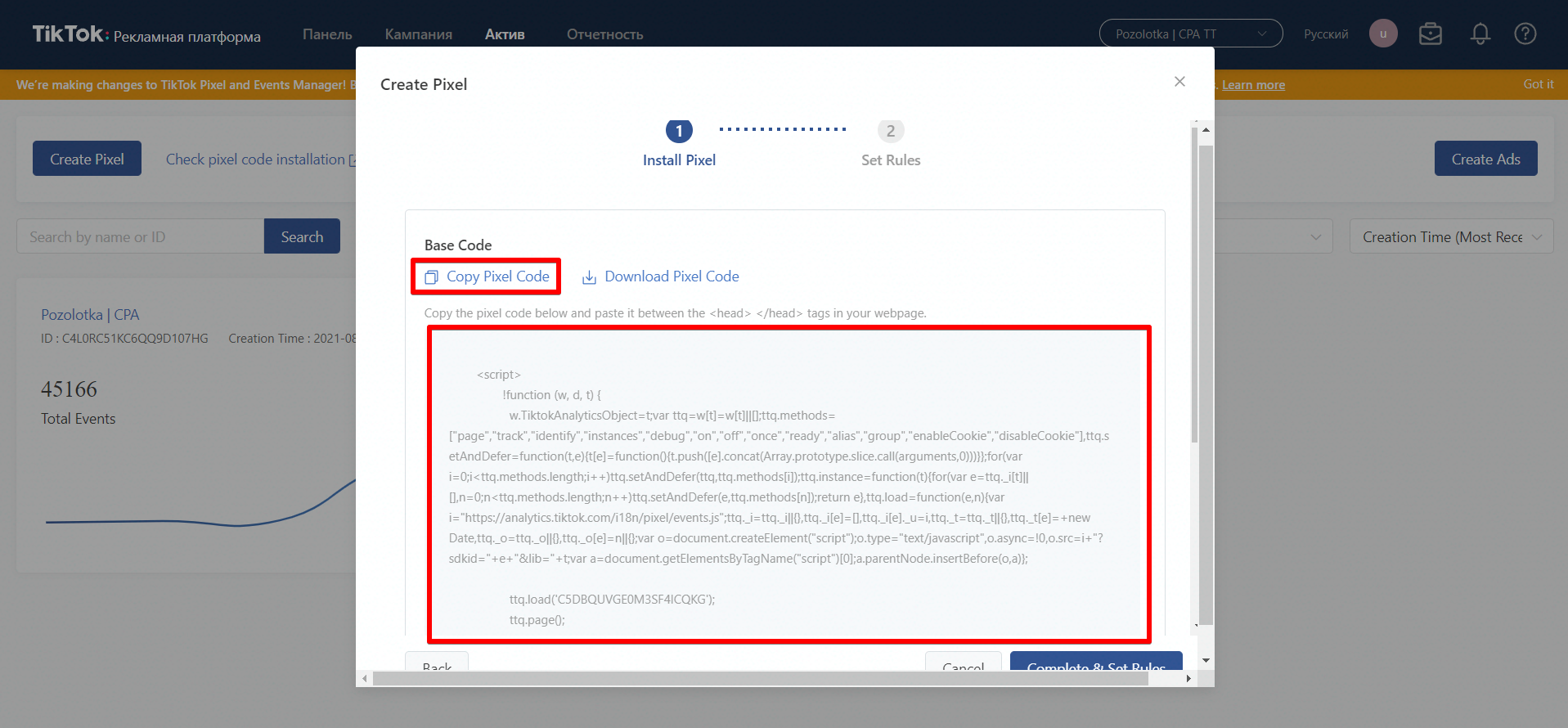 Рухаємося далі — встановлення пікселя на сайт. Напевно, це найпростіший крок із даного гайду. Для встановлення коду на сайт у вас є багато варіантів. Наприклад, через GTM, поставити ТЗ програмісту, щоби він додав код у <head> сайту або інтеграції. Обов’язково для встановлення пікселя потрібен основний код, який генерується в кабінеті Tik Tok.