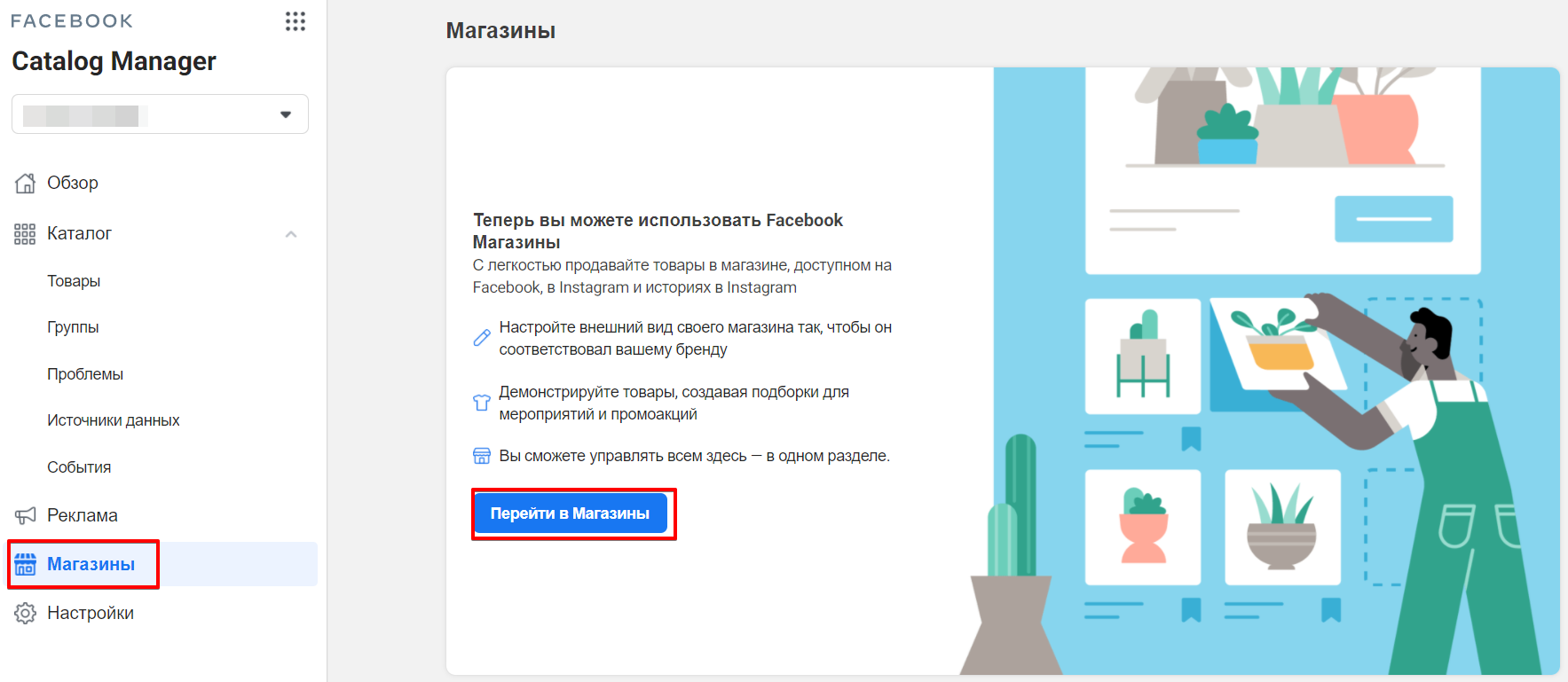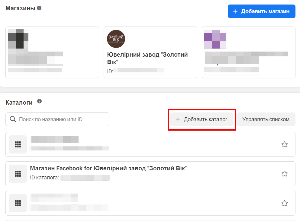 У "Catalog Manager" виберіть вкладку "Магазини" і переходьте безпосередньо до створення Facebook Store.