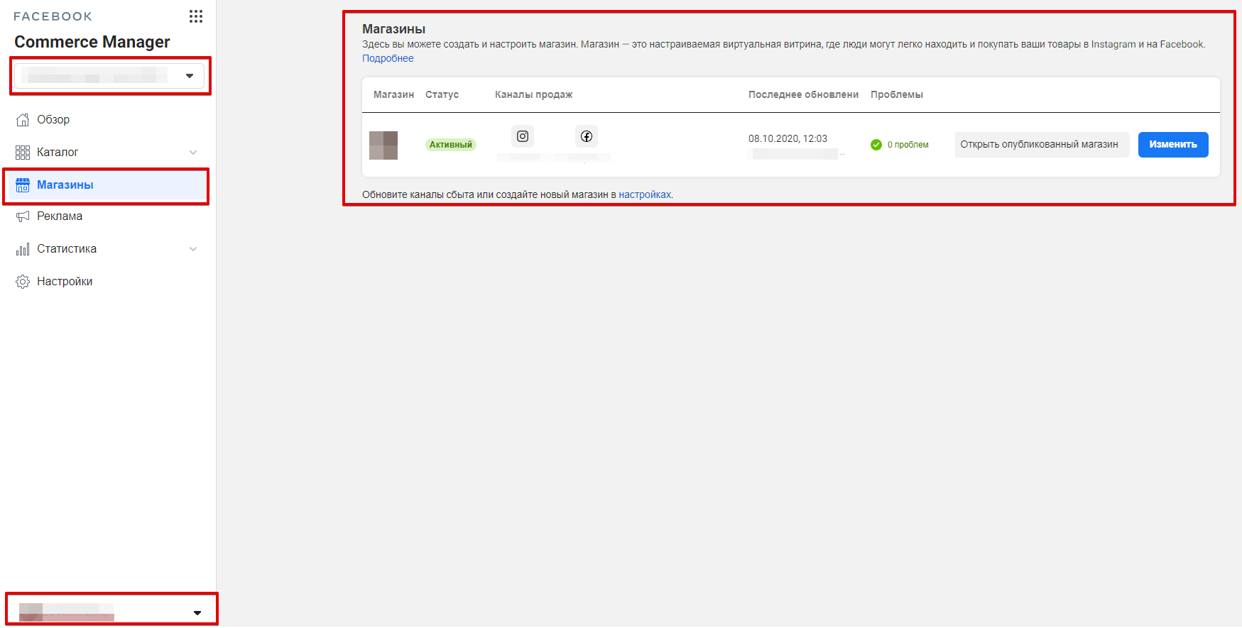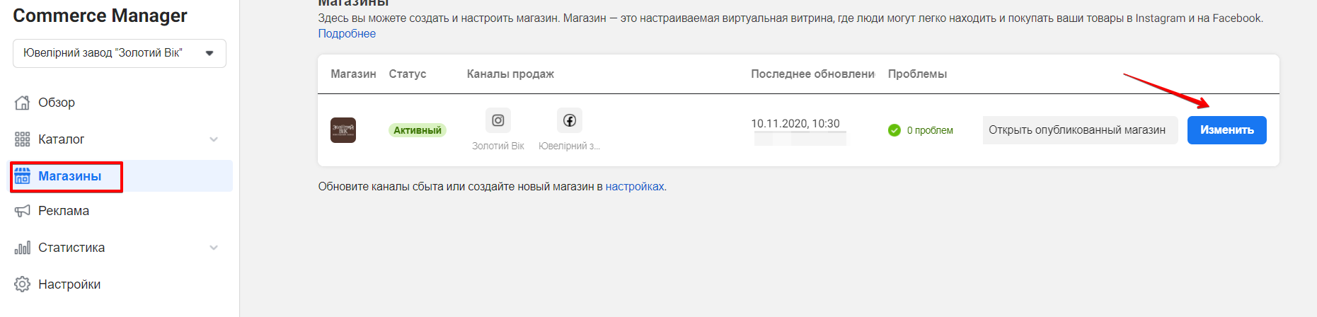 Створений магазин буде доступний в Commerce Manager у вкладці "Магазини". Тут ви можете переглянути опублікований Facebook Store або ж внести у нього зміни.