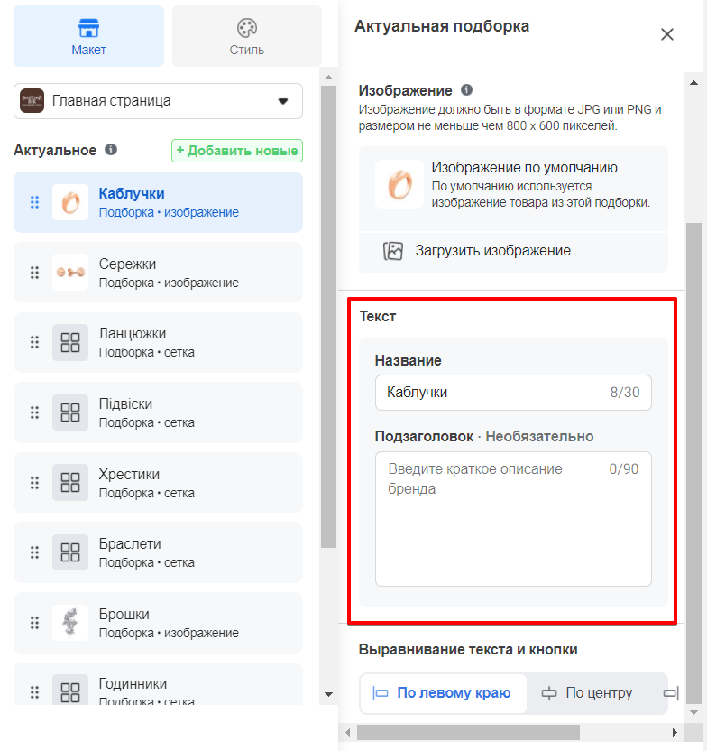 Також ви можете редагувати текст заголовків і опису. За замовчуванням у заголовок розділу буде автоматично підтягуватися назва каталогу.