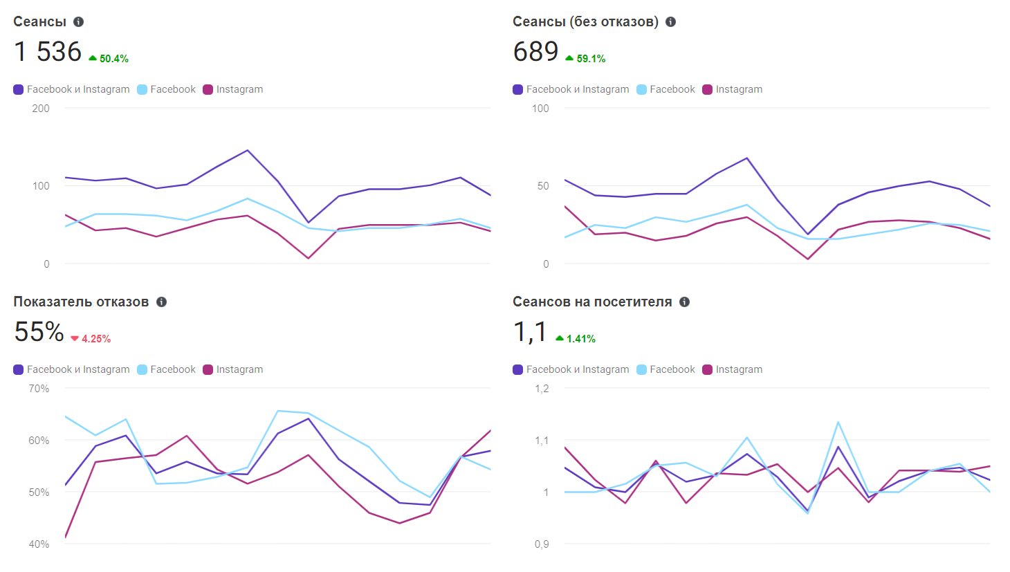 У "Трафіку" — кількість сеансів, показник відмов, кількість нових відвідувачів.