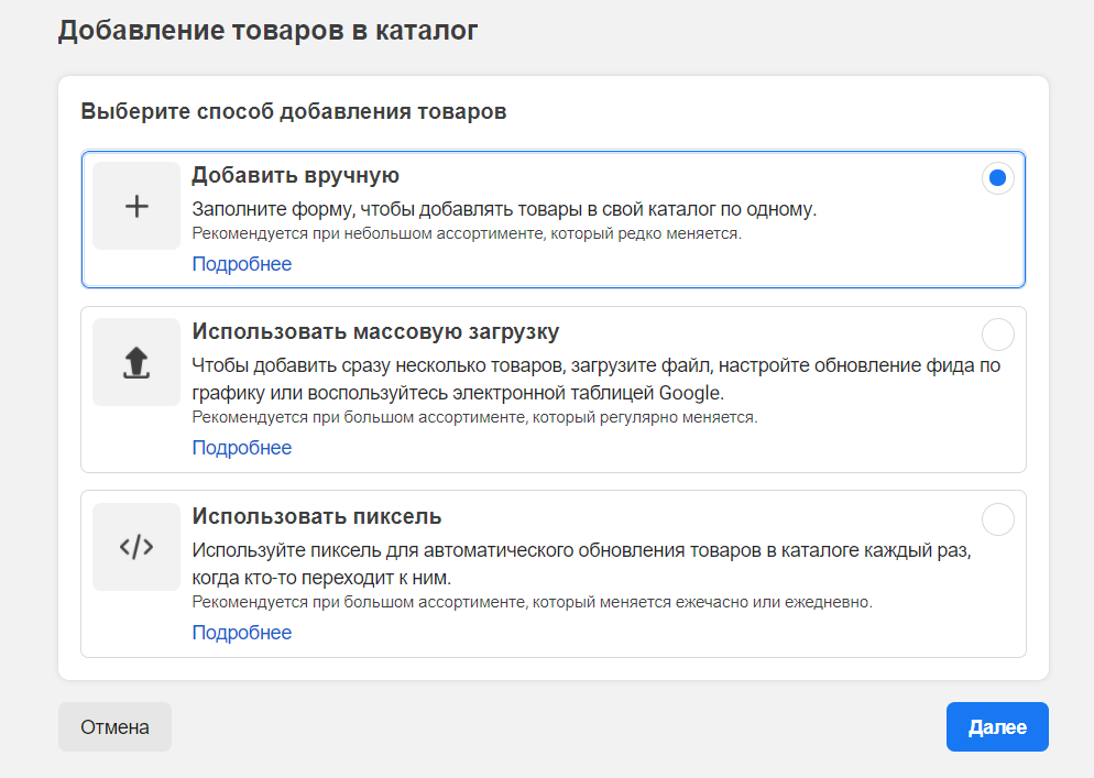 Ви можете завантажити інформацію про товари через фід даних або піксель Facebook.
