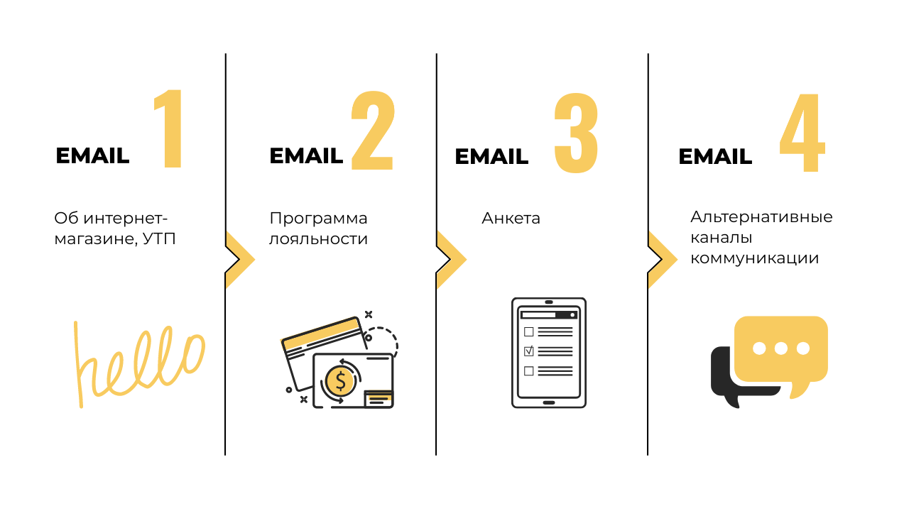Якщо не знаєте з чого почати підготовку листів, тримайте готову схему welcome-ланцюжка для eCommerce, яка добре себе зарекомендувала.