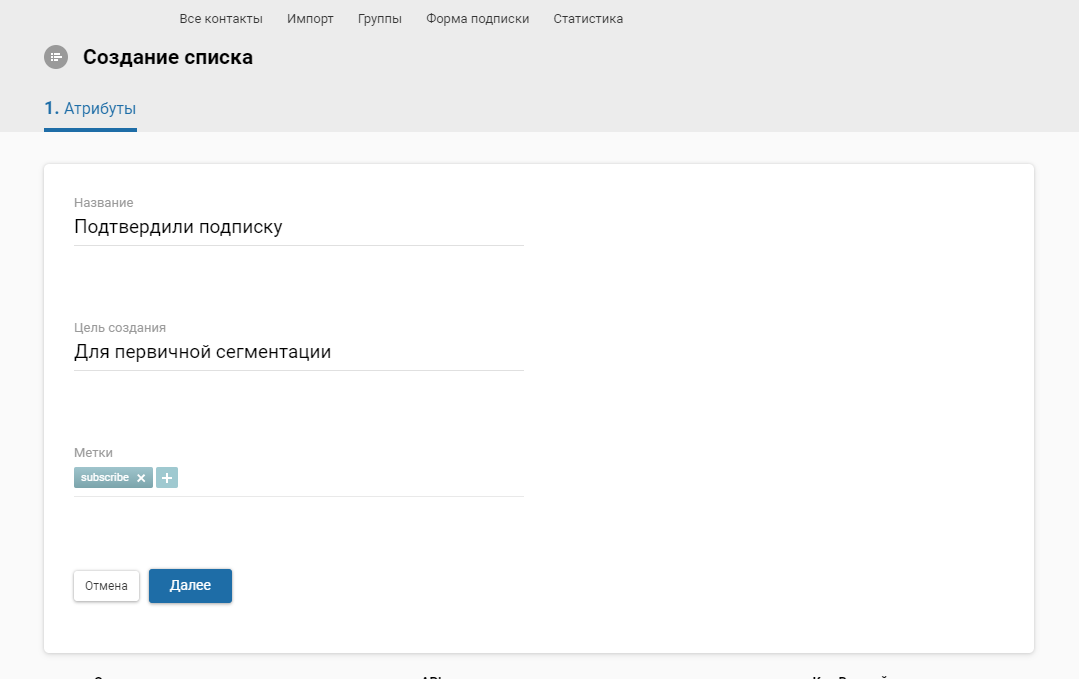 У вашому обліковому записі в eSputnik зайдіть у розділ Контакти ➝ Групи ➝ Нова група, тип групи Список ➝ Створити. На цьому кроці даємо назву групі, вказуємо мету створення, також можна прикріпити мітку.