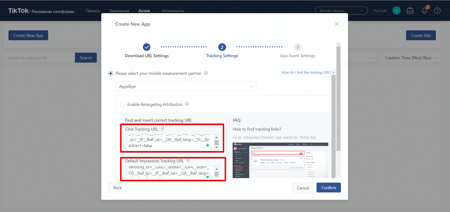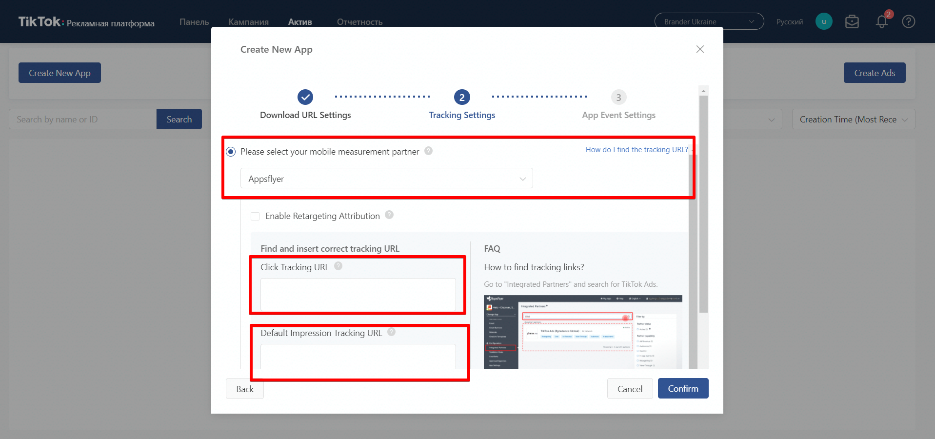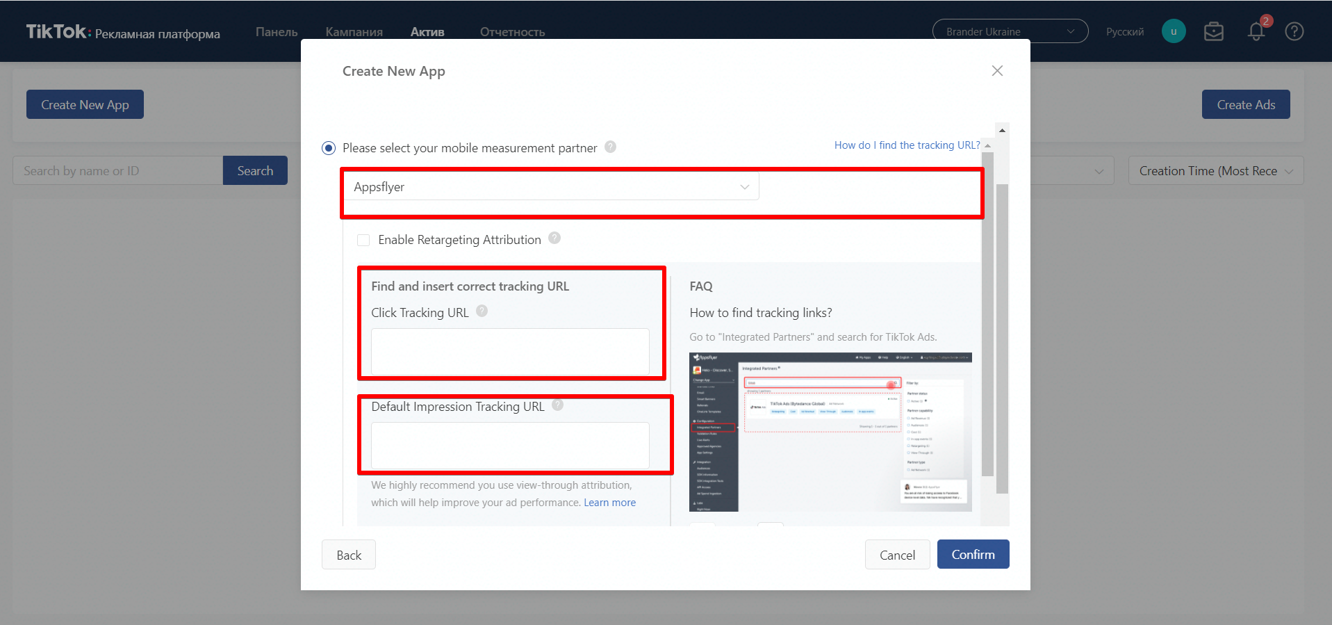 - Далі в партнерах вибираємо AppsFlyer. У самому вікні Tik Tok запитує 2 параметри Click Tracking URL та Default Impression Tracking URL.