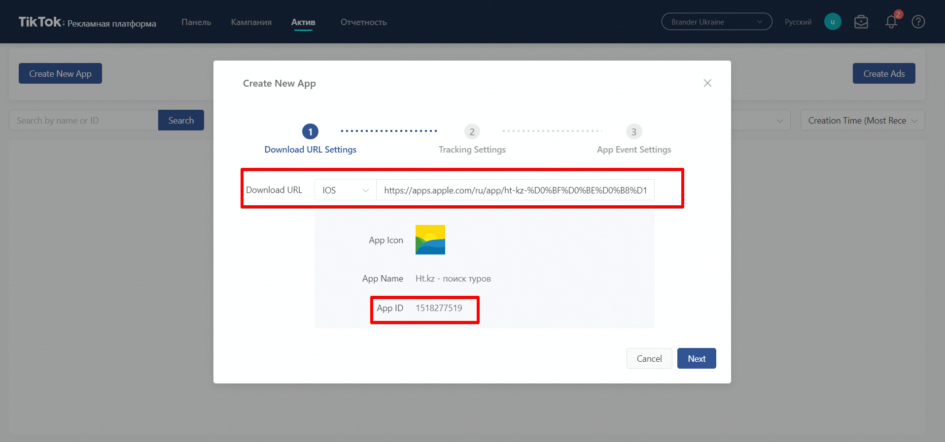 - Далі в партнерах вибираємо AppsFlyer. Так само як і в Android, Tik Tok запитує 2 параметри Click Tracking URL і Default Impression Tracking URL.