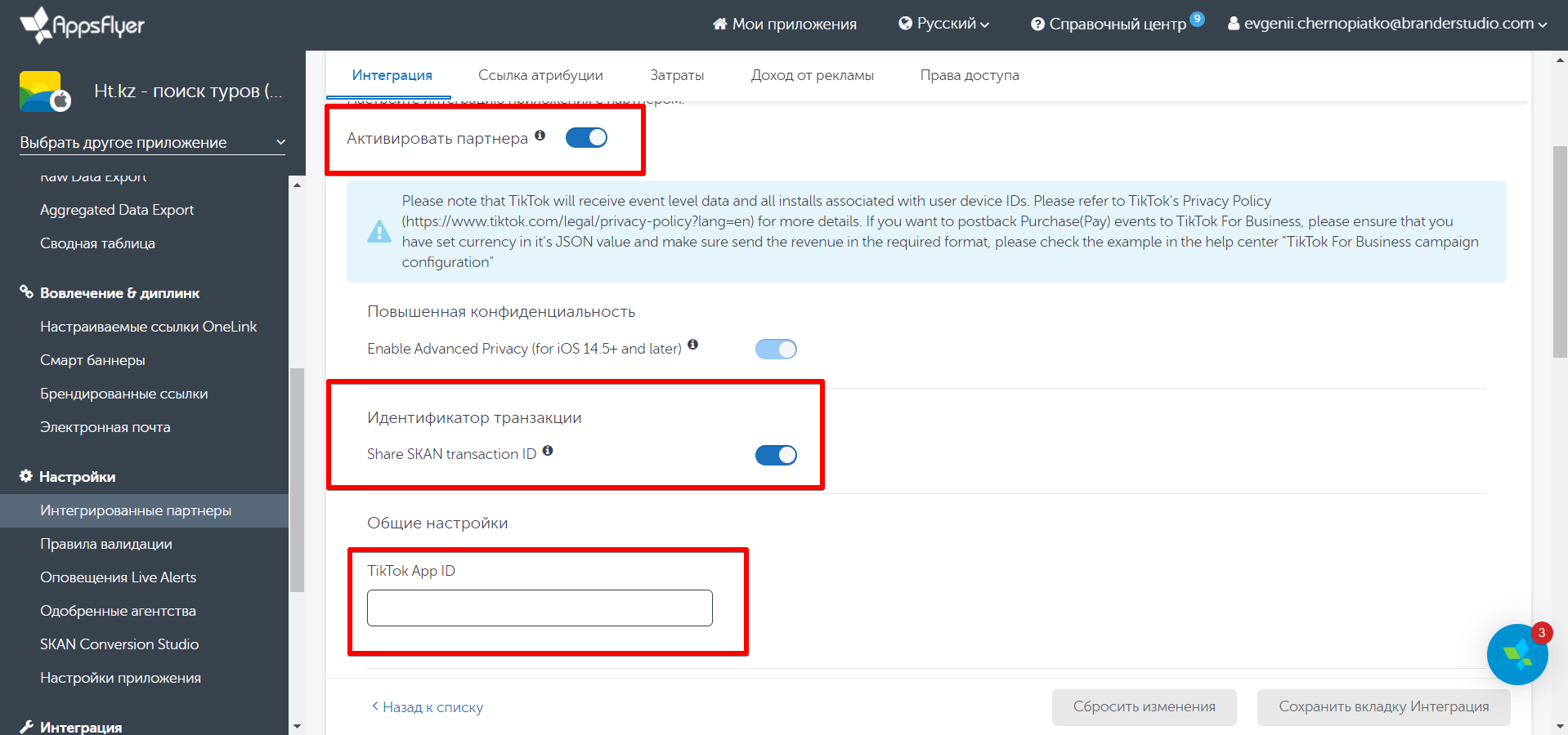 - Знаходимо в перелік TikTok For Business та заходимо всередину. Перше, що потрібно зробити, це включити інтеграцію, додати ID додатка з кабінету Tik Tok і включити SKAN transaction ID (transaction ID допомагають партнеру розшифрувати значення конверсії).