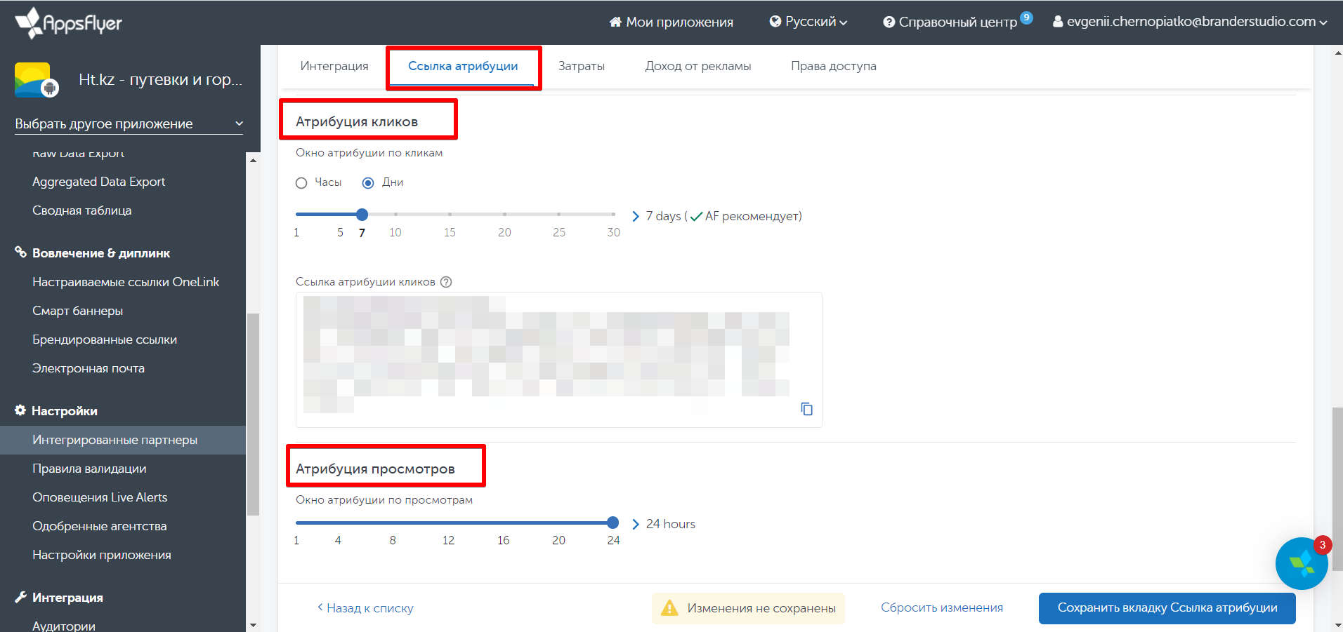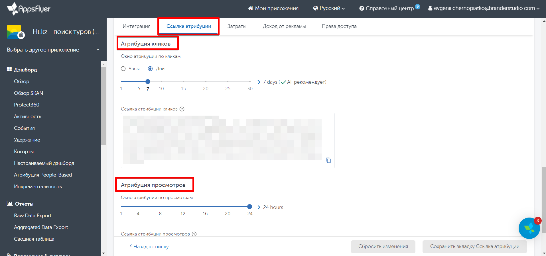 - Заходимо в Посилання атрибуції та скролімо вниз до Атрибуції клаців та переглядів. Налаштовуючи вікна атрибуції, AppsFlyer рекомендує атрибуцію для клаців 7 днів, а для переглядів — 24 години.