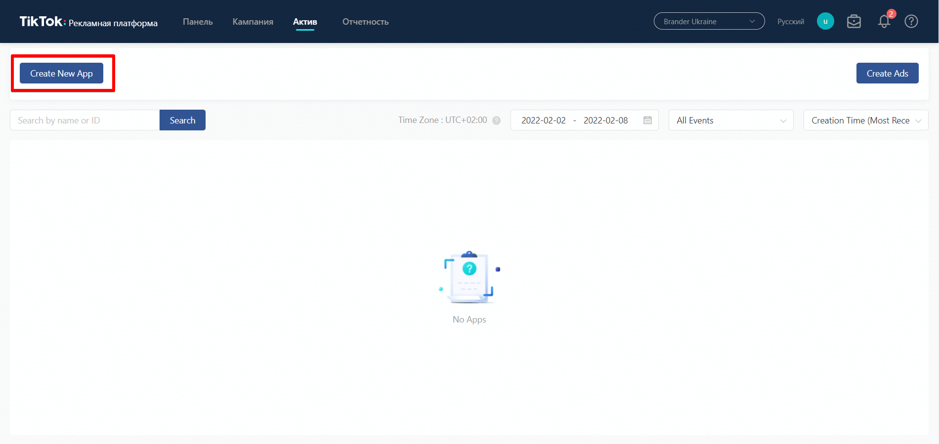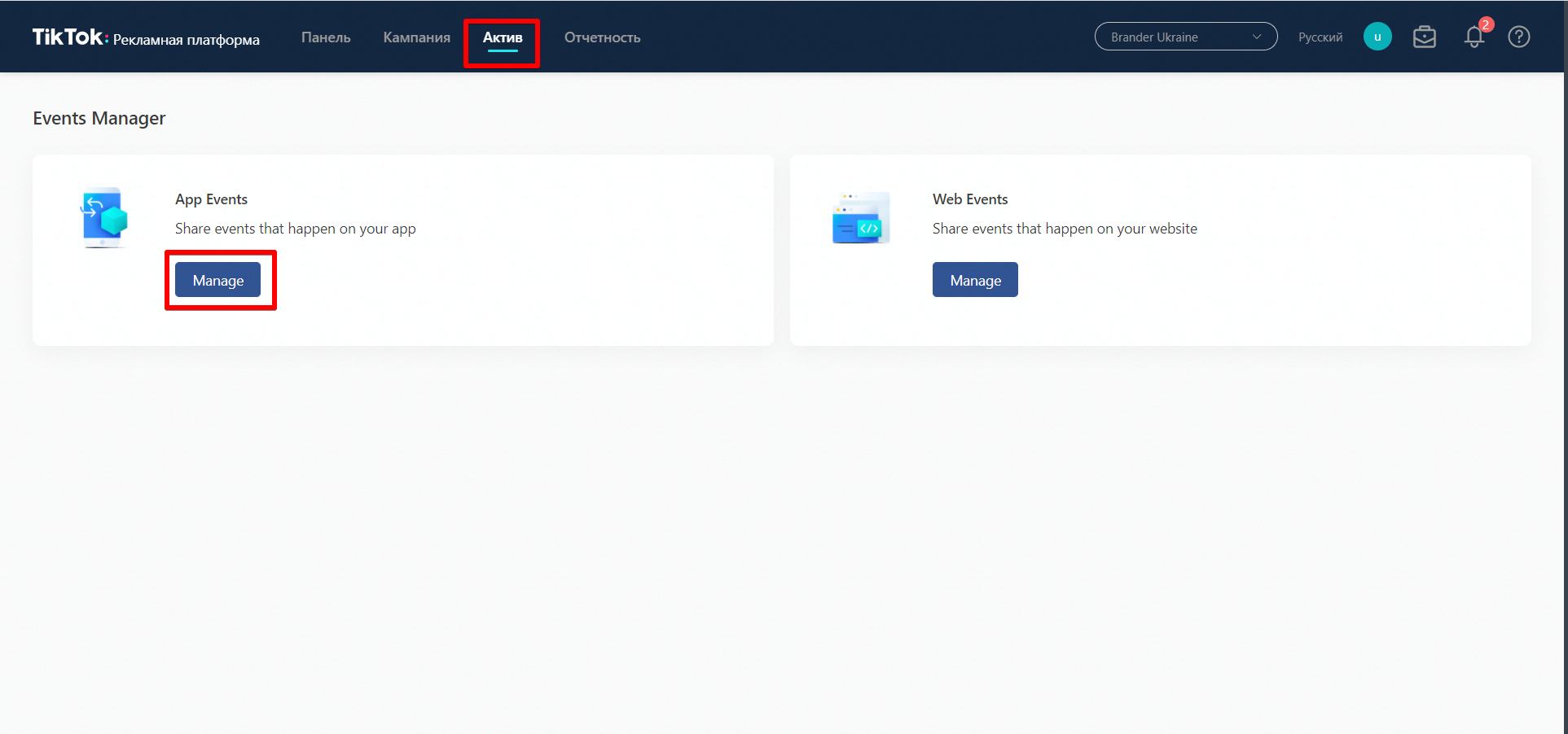 - Заходимо до кабінету Tik Tok у події та тиснемо події застосунку.