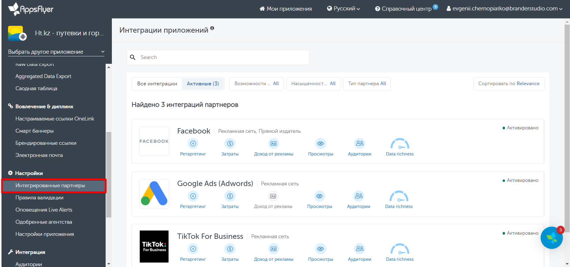 - Заходимо в кабінет AppsFlyer, де підключений ваш застосунок і заходимо в Інтегровані партнери. Обов’язково враховуйте, що для платформи Android та IOS різні налаштування інтеграції. Тому перед підключенням переконайтеся, що вибрали саме Android.