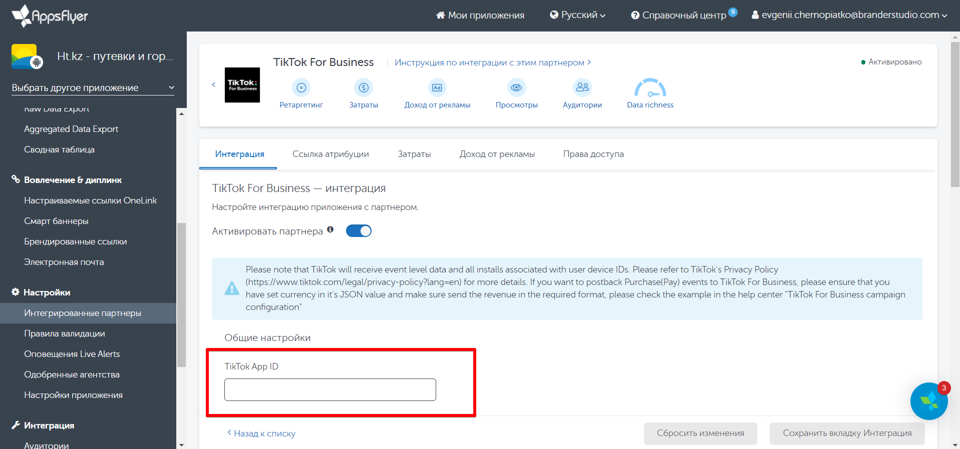 - Знаходимо в переліку TikTok For Business та заходимо всередину. Перше, що потрібно зробити, це увімкнути інтеграцію та додати ID застосунку з кабінету Tik Tok.
